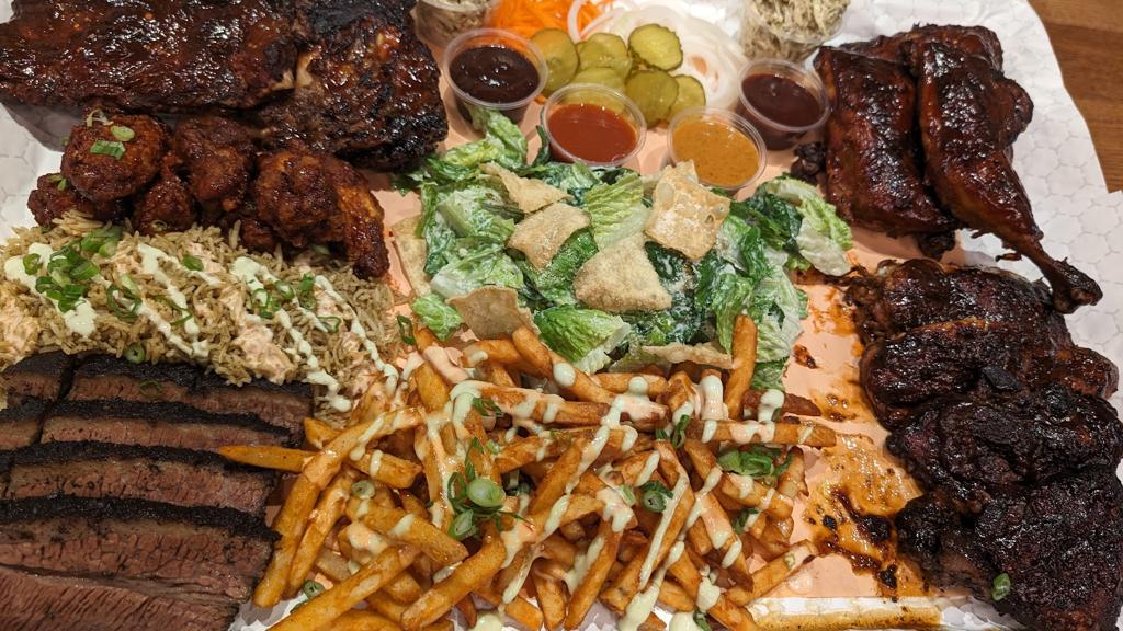 Order full size platter. Great food serving size is good for 5 adults and 2-3 kids. We had 5ad + 3 kids and we still had some left overs.