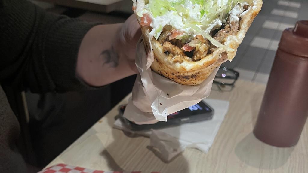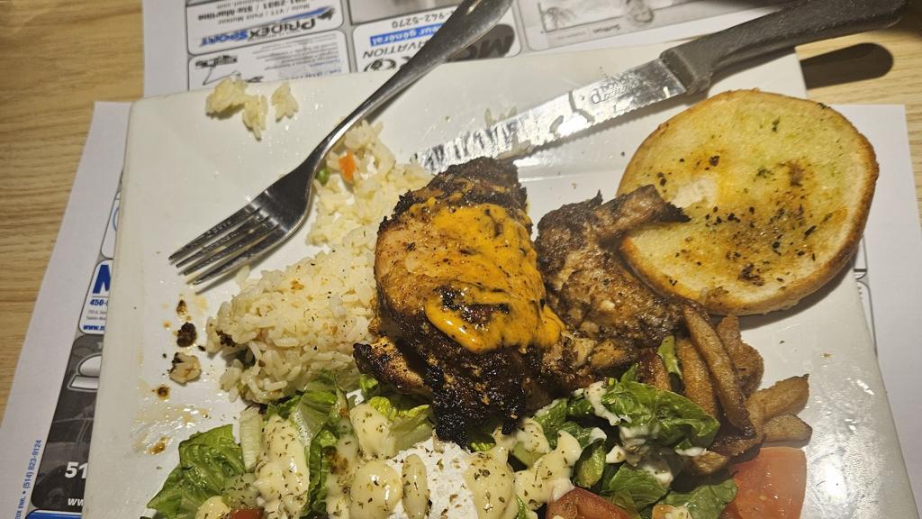 Service was great. We ordered calamari plate and half chicken plate which came with rice and salad. Chicken was very well made. Both plates also came with a garlic bun. Area seems a bit confusing but grill-in and restaurant drive-in are in the same building, oh and it's halal too.
