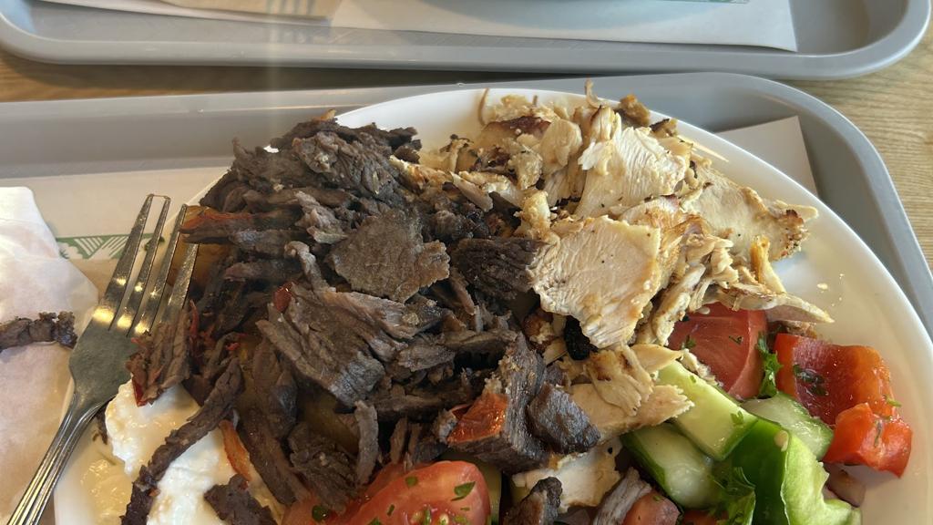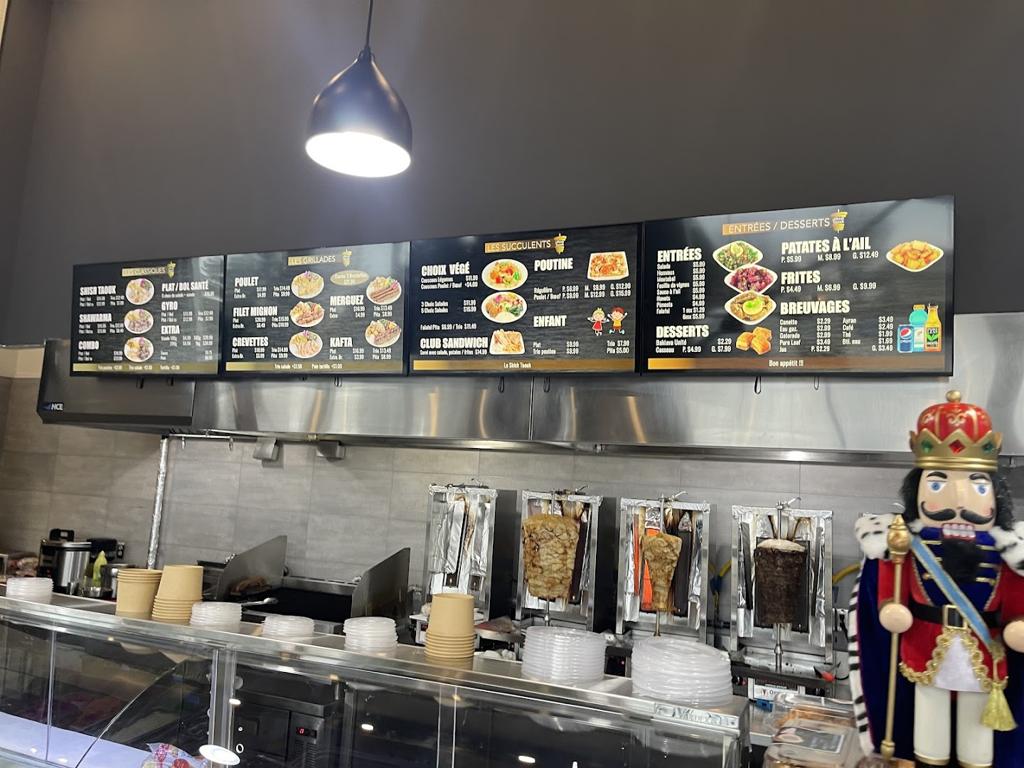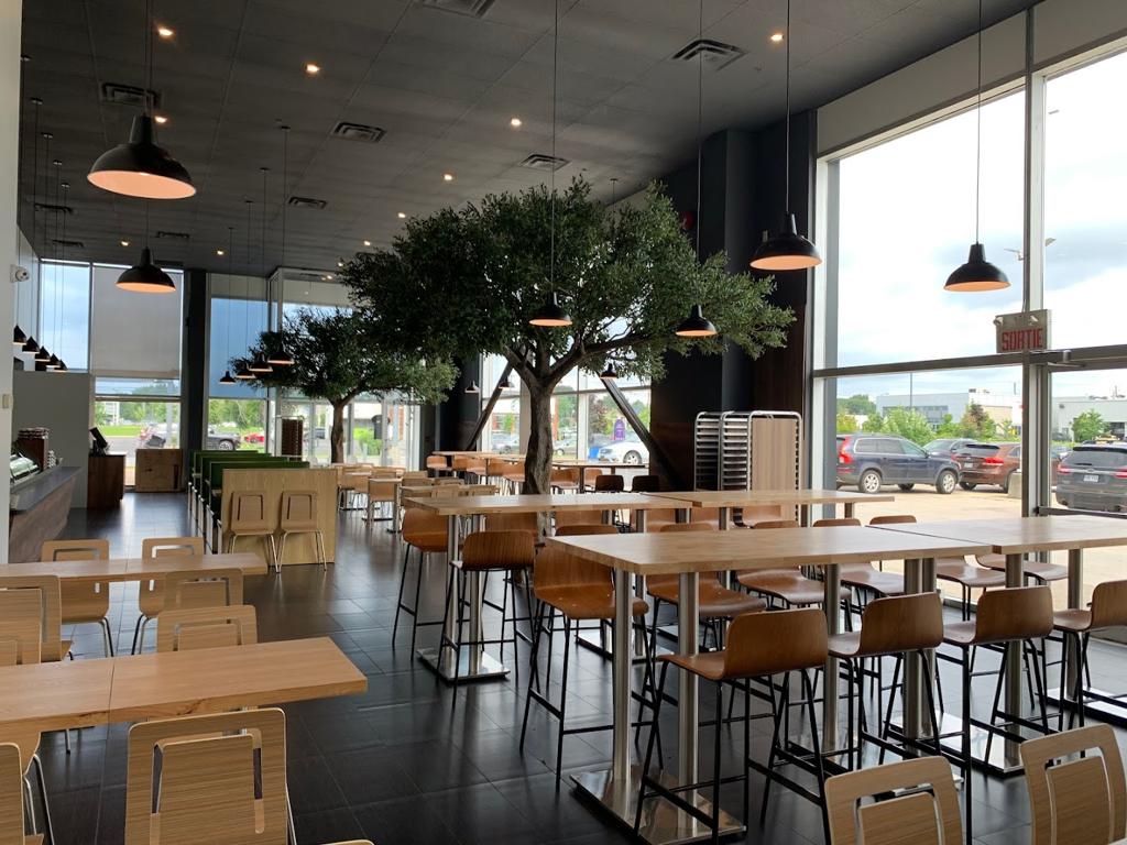 The restaurant is big. It's a bit sad to see that the restaurant was mostly empty on a Saturday night because the food was pretty good. It was a bit quiet though which made it a bit less comfy to eat here but the interior decor was so confortable which the wooden tables and the interior trees. For around 15$, you can get a trio where you pick the sides to either be potatoes or a salad and they are both pretty good. I do like the proportions of vegetables and meat in their pita which made the meal refreshing and less greasy. The poutine however had a bit too much sauce in my opinion and the spices made the whole poutine too sour for my liking. Even though the top part was great, as we got lower and lower in the bowl, the food was more and more sour to a point where the flavours were just too intense for me. The service was also welcoming and quite friendly which was nice. I do feel like the place was a bit dirty though, the tables were a bit sticky and there was some leftover vegetables on the tables from previous customers.